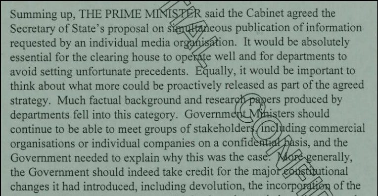 And finally, just before FOI came into force, this is how Tony Blair summarised matters to the cabinet, several years before he announced he was a ‘nincompoop’ for introducing the law.