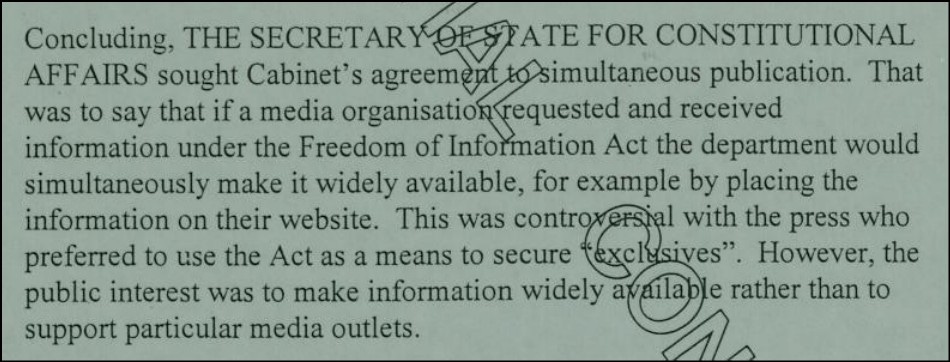 It is interesting to note that the cabinet minister responsible for FOI, the Constitutional Affairs Secretary Lord Falconer, was keen to get departments to publish FOI disclosures on their websites at the same time as giving the information to the requester. This was particularly in the case of the media.