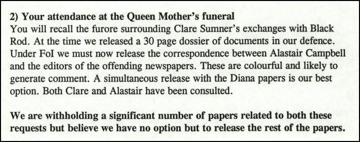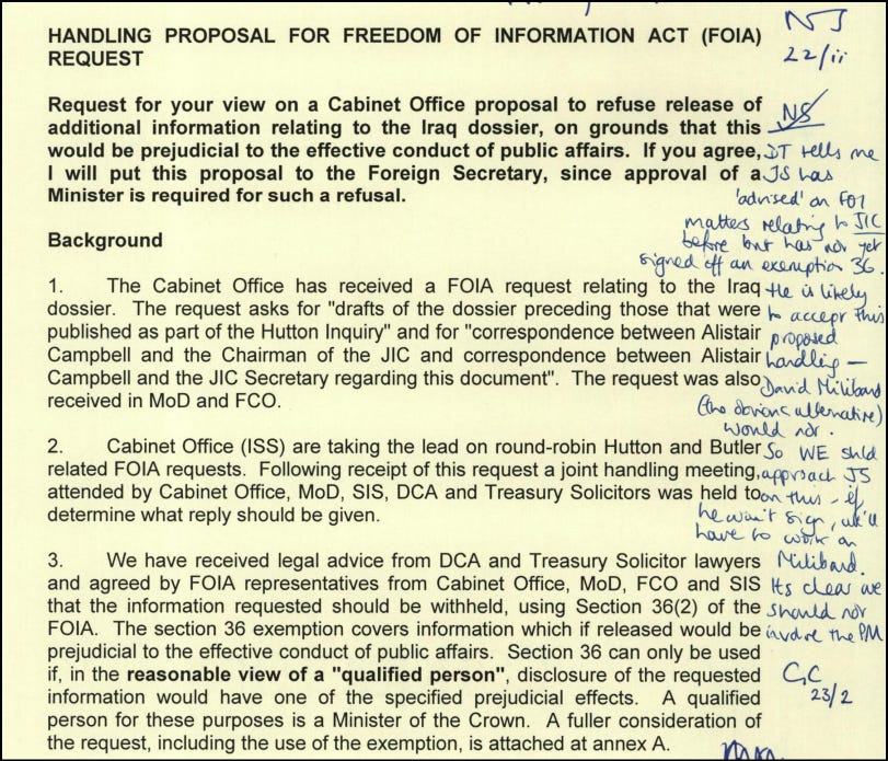Other examples provide evidence of reluctant information releases which were enforced by the FOI law, as in this memo which an official sent to Blair.