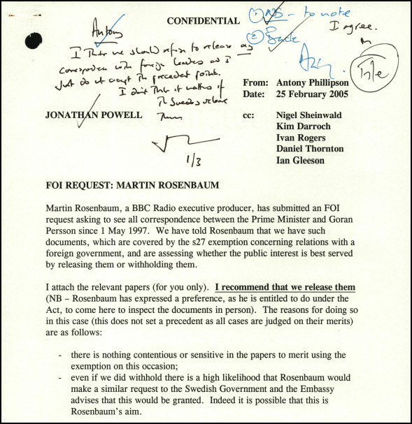 I was particularly interested to find discussion of how to respond to one of my early FOI requests - for correspondence between Blair and the Swedish prime minister, Goran Persson. I’d already obtained some of this from the Swedish government, which had a greater culture of openness, and wanted to see what Downing Street would supply in comparison.